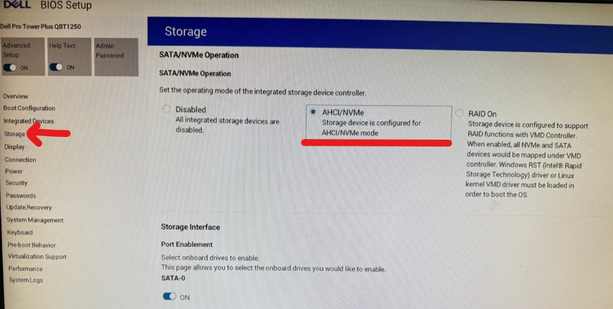 - ‘Storage’ 기능을 찾아서 기존 ‘RAID On’ 모드에서 ‘AHCI/NVMe’ 모드 혹은 저장장치 관련 항목을 찾아 변경을 해줍니다.